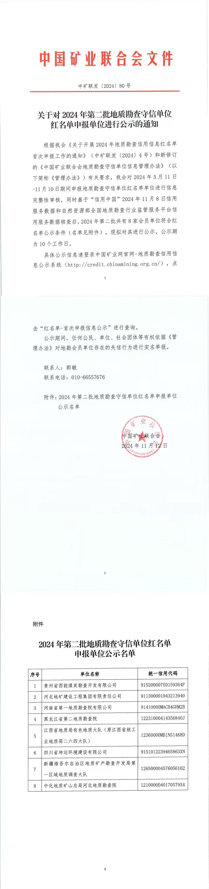 根據(jù)我會《關(guān)于開展2024年地質(zhì)勘查信用信息紅名單首次申報工作的通知》(中礦聯(lián)發(fā)[2024]4號)和新修訂的《中國礦業(yè)聯(lián)合會地質(zhì)勘查守信單位信息管理辦法》(以下簡稱《管理辦法》)有關(guān)要求,我會對2024年5月11日-11月10日期間申報地質(zhì)勘查守信單位紅名單單位進(jìn)行信息完整性審核,同時基于“信用中國”2024年11月8日信用服務(wù)數(shù)據(jù)和自然資源部全國地質(zhì)勘查行業(yè)監(jiān)管服務(wù)平臺信用服務(wù)數(shù)據(jù)核查后,2024年第二批共有8家會員單位符合紅名單公示條件(名單見附件),現(xiàn)擬對其進(jìn)行公示,公示期為10個工作日。