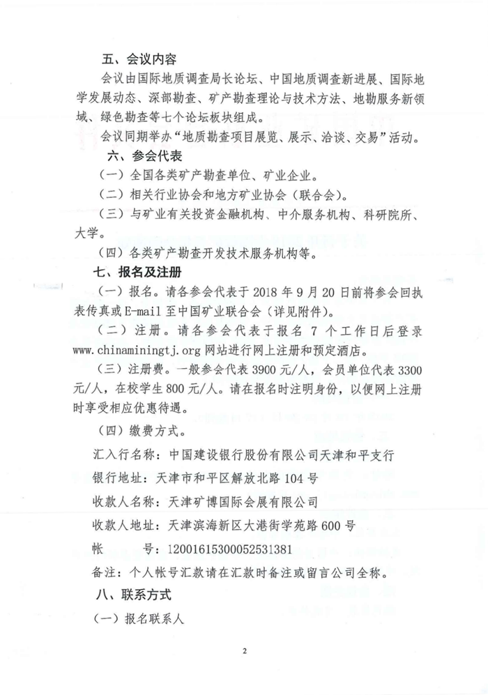 為了貫徹落實新時代地質(zhì)工作的新任務(wù)、新使命,進一步加強礦產(chǎn)勘查開發(fā)領(lǐng)域的交流合作,促進我國礦業(yè)經(jīng)濟健康可持續(xù)發(fā)展,中國礦業(yè)聯(lián)合會擬在天津召開2018中國探礦者年會,本次會議與2018中國(第二十屆)國際礦業(yè)大會同期舉行。