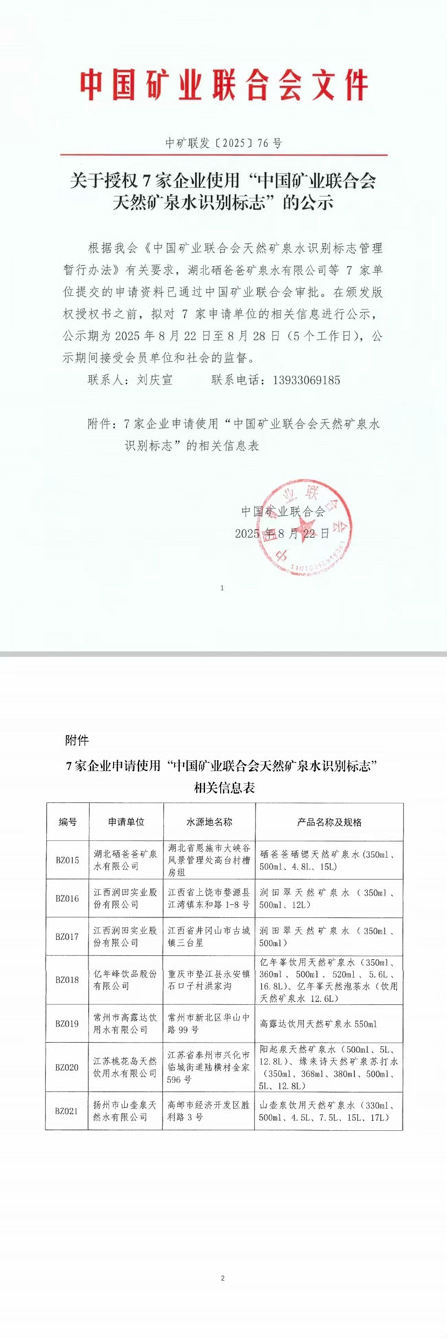 關(guān)于授權(quán)7家企業(yè)使用“中國礦業(yè)聯(lián)合會天然礦泉水識別標(biāo)志”的公示