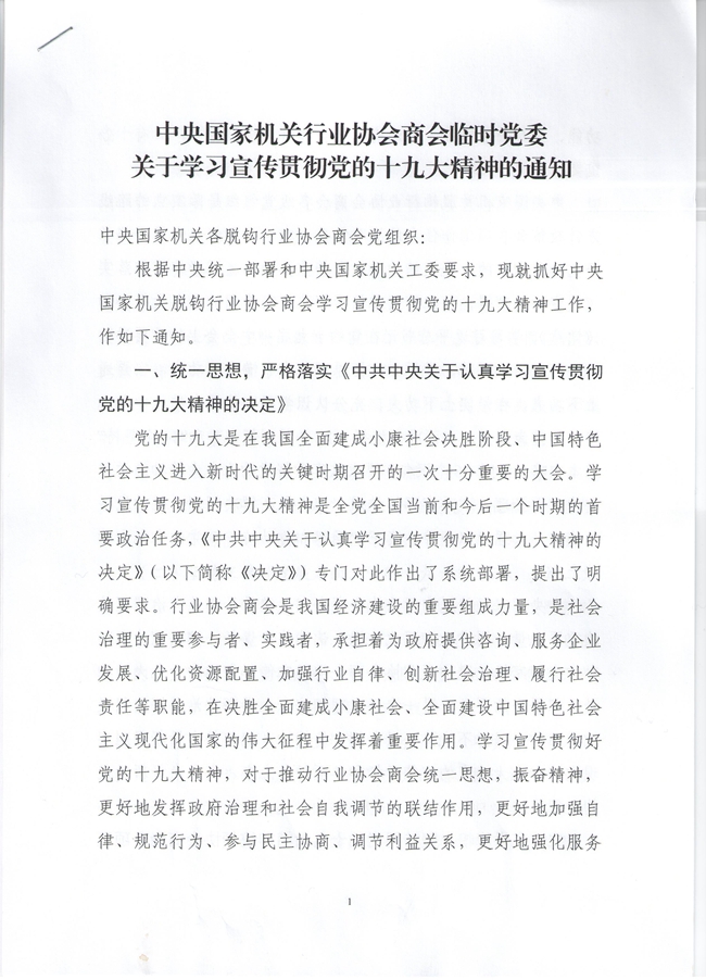 中央國家機(jī)關(guān)行業(yè)協(xié)會商會臨時(shí)黨委關(guān)于學(xué)習(xí)宣傳貫徹黨的十大九精神的通知