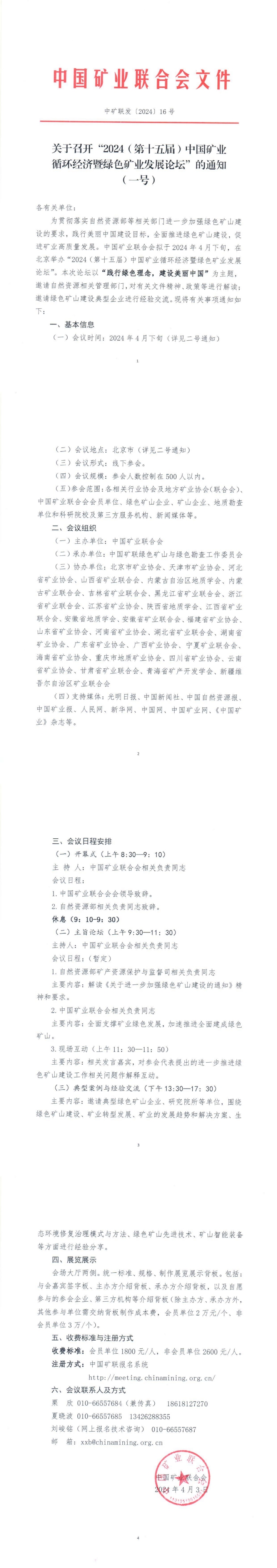 下載:關(guān)于召開(kāi)“2024(第十五屆)中國(guó)礦業(yè)循環(huán)經(jīng)濟(jì)暨綠色礦業(yè)發(fā)展論壇”的通知(一號(hào)).pdf