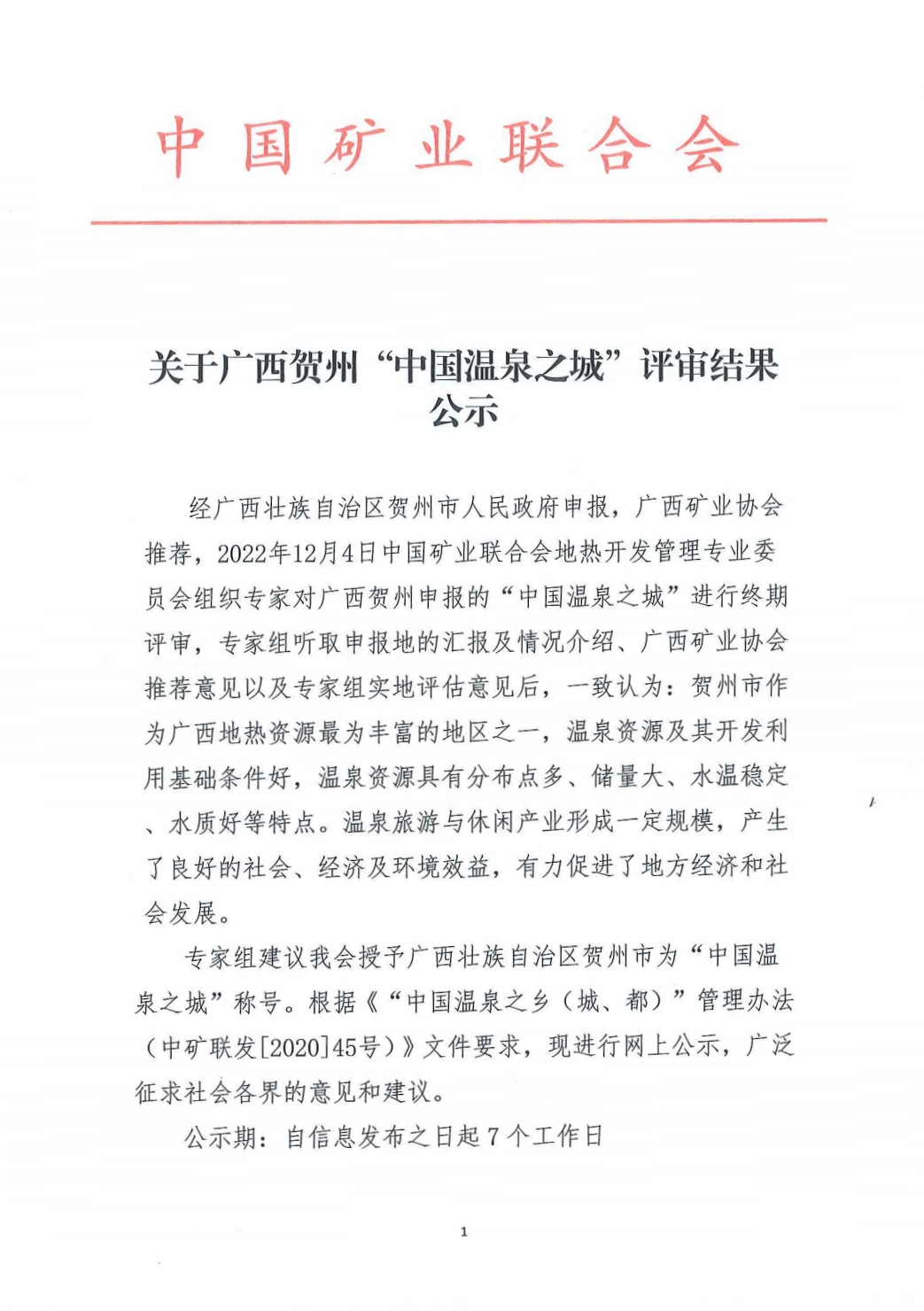 關于廣西賀州“中國溫泉之城”評審結果公示
