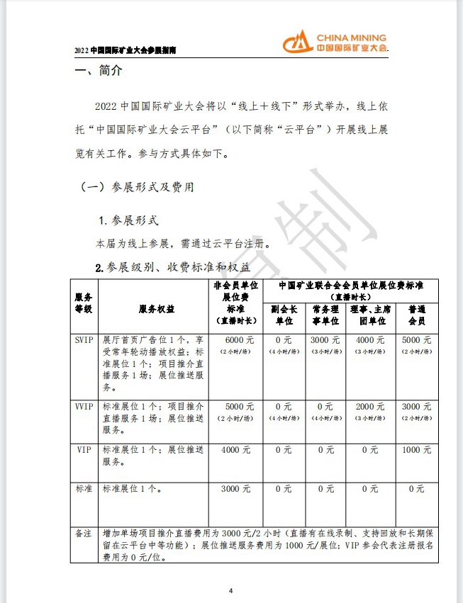 2022 中國(guó)國(guó)際礦業(yè)大會(huì)將以“線上+線下”形式舉辦,線上依托“中國(guó)國(guó)際礦業(yè)大會(huì)云平臺(tái)”(以下簡(jiǎn)稱“云平臺(tái)”)開(kāi)展線上展覽有關(guān)工作。