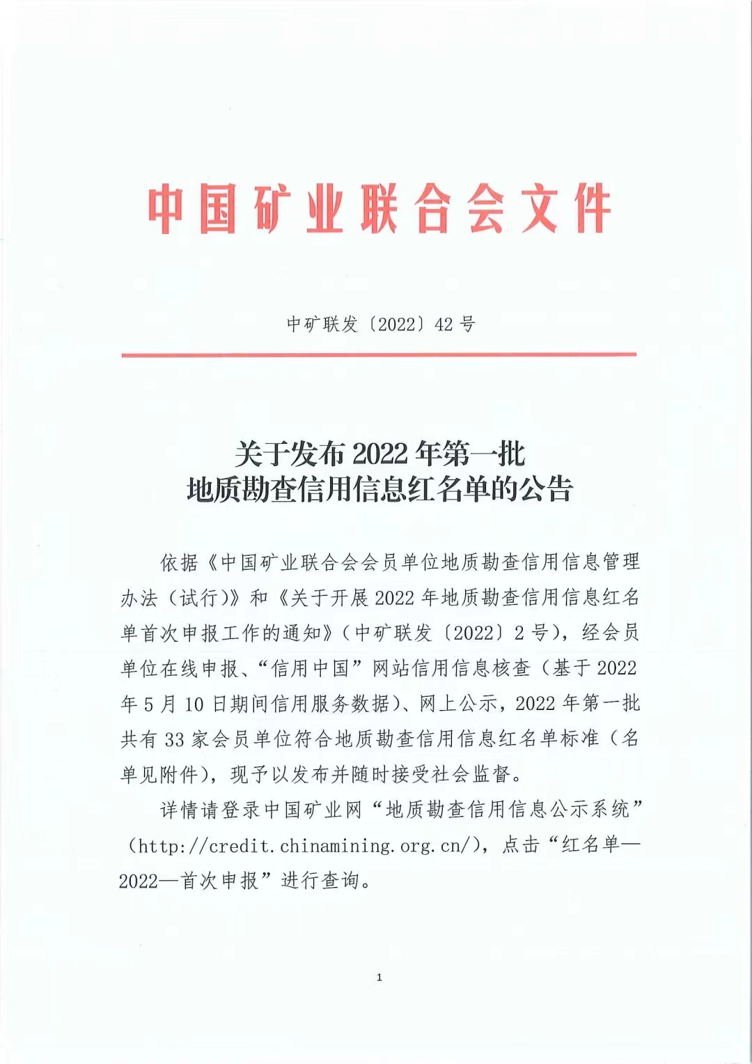 依據(jù)《中國礦業(yè)聯(lián)合會會員單位地質(zhì)勘查信用信息管理辦法(試行)》和《關(guān)于開展2022年地質(zhì)勘查信用信息紅名單首次申報工作的通知》(中礦聯(lián)發(fā)〔2022〕2號),經(jīng)會員單位在線申報、“信用中國”網(wǎng)站信用信息核查(基于2022年5月10日期間信用服務(wù)數(shù)據(jù))、網(wǎng)上公示,2022年第一批共有33家會員單位符合地質(zhì)勘查信用信息紅名單標準(名單見附件),現(xiàn)予以發(fā)布并隨時接受社會監(jiān)督。