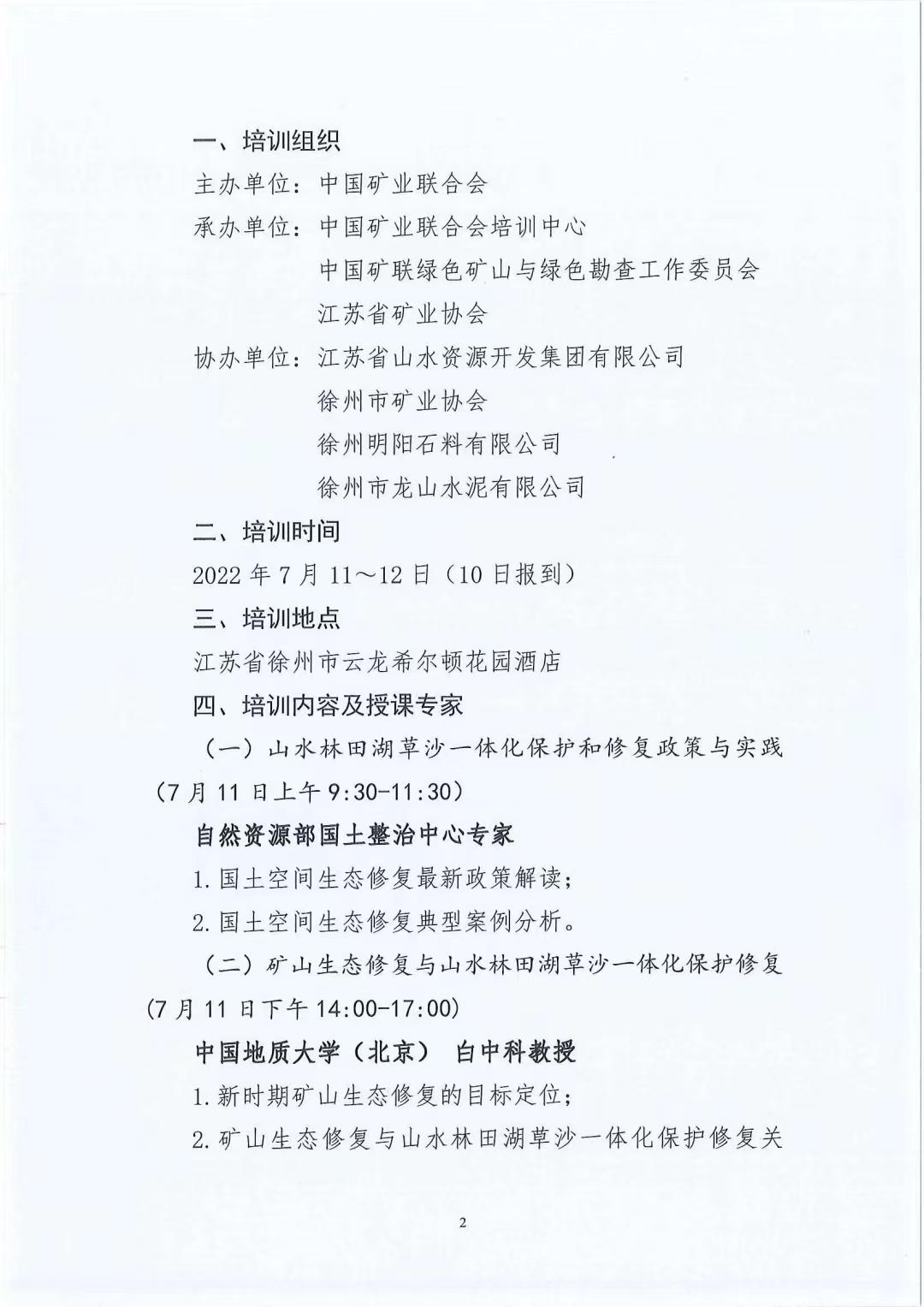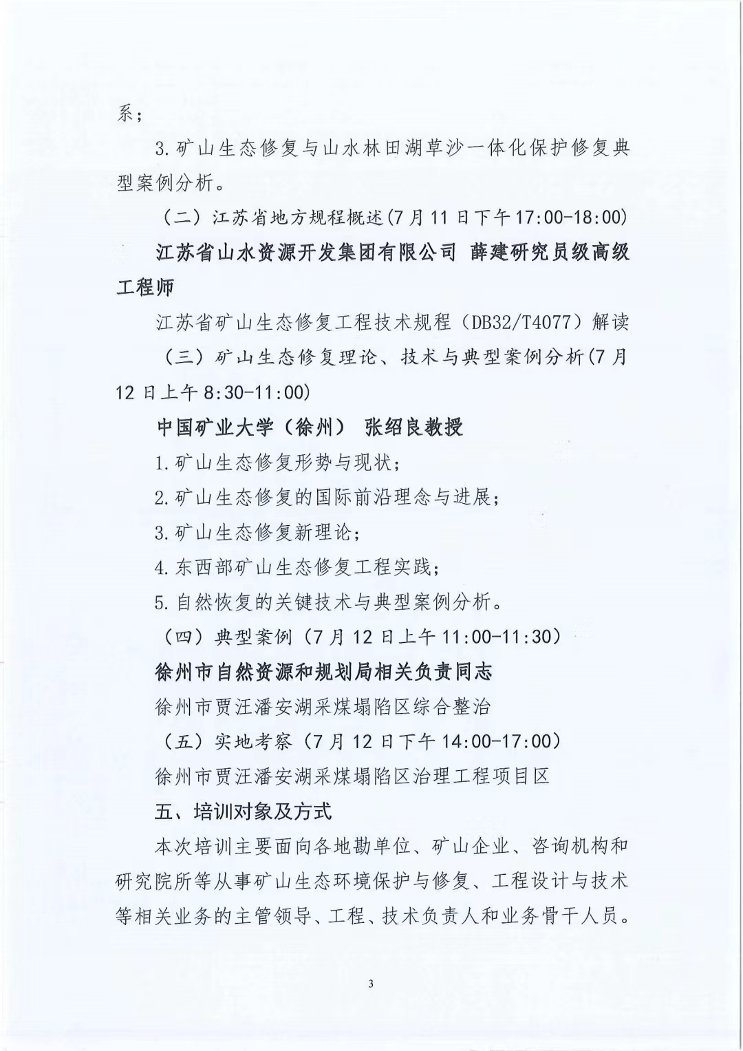 為深入學(xué)習(xí)貫徹習(xí)近平生態(tài)文明思想,全面貫徹黨的十九大和十九屆歷次全會(huì)精神,按照國家發(fā)展改革委、自然資源部等部門關(guān)于統(tǒng)籌山水林田湖草沙一體化保護(hù)和修復(fù)的思路,根據(jù)《全國重要生態(tài)系統(tǒng)保護(hù)和修復(fù)重大工程總體規(guī)劃(2021-2035年)》要求。為促進(jìn)地勘單位和礦山企業(yè)在生態(tài)保護(hù)與礦山修復(fù)建設(shè)中發(fā)揮更大的作用,中國礦業(yè)聯(lián)合會(huì)與江蘇省礦業(yè)協(xié)會(huì)擬定于7月11~12日聯(lián)合舉辦礦山生態(tài)修復(fù)與工程實(shí)踐培訓(xùn)班。培訓(xùn)班圍繞礦山生態(tài)修復(fù)政策、規(guī)范標(biāo)準(zhǔn)、基礎(chǔ)理論、案例解析、工程技術(shù)、規(guī)劃編制要點(diǎn)、重點(diǎn)、難點(diǎn)等問題聘請(qǐng)國內(nèi)一流專家學(xué)者釋疑解惑,并選擇典型現(xiàn)場(chǎng)開展實(shí)地考察交流。