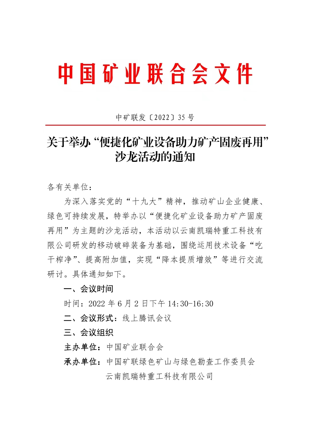 關(guān)于舉辦“便捷化礦業(yè)設(shè)備助力礦產(chǎn)固廢再用” 沙龍活動的通知