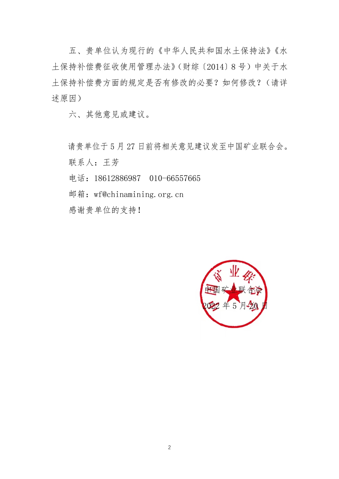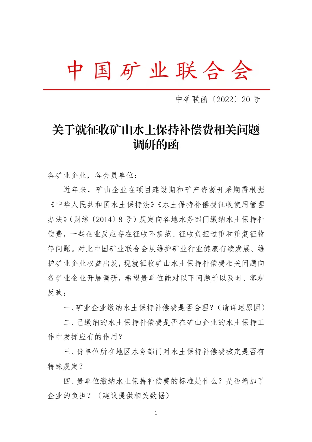 中國礦業(yè)聯(lián)合會關(guān)于就征收礦山水土保持補(bǔ)償費(fèi)相關(guān)問題調(diào)研的函