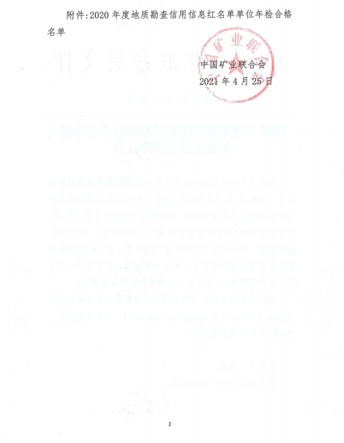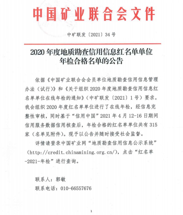依據(jù)《中國礦業(yè)聯(lián)合會會員單位地質(zhì)勘查信用信息管理辦法(試行)》和《關(guān)于組織2020年度地質(zhì)勘查信用信息紅名單單位在線年檢的通知》(中礦聯(lián)發(fā)〔2021〕1號)要求,我會組織2020年度紅名單單位進行了在線年檢,經(jīng)信息完整性審核,同時基于“信用中國”2021年4月12-16日期間信用服務(wù)數(shù)據(jù)信用核查后,年檢合格的紅名單單位共有315家(名單見附件)?,F(xiàn)予以公告并隨時接受社會監(jiān)督。