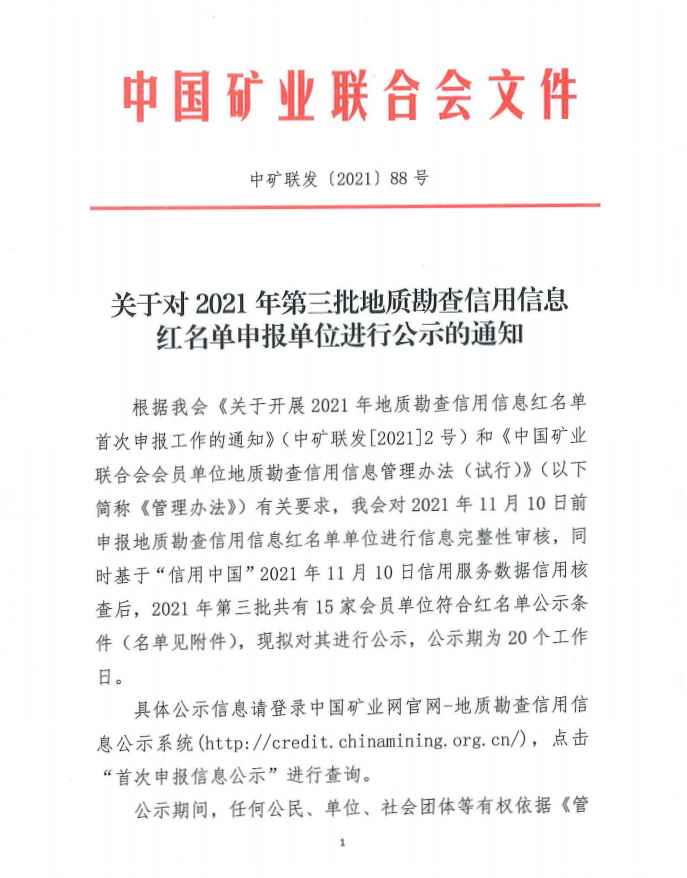 根據(jù)我會《關(guān)于開展2021年地質(zhì)勘查信用信息紅名單首次申報工作的通知》(中礦聯(lián)發(fā)[2021]2號)和《中國礦業(yè)聯(lián)合會會員單位地質(zhì)勘查信用信息管理辦法(試行)》(以下簡稱《管理辦法》)有關(guān)要求,我會對2021年11月10日前申報地質(zhì)勘查信用信息紅名單單位進行信息完整性審核,同時基于“信用中國”2021年11月10日信用服務(wù)數(shù)據(jù)信用核查后,2021年第三批共有15家會員單位符合紅名單公示條件(名單見附件),現(xiàn)擬對其進行公示,公示期為20個工作日。