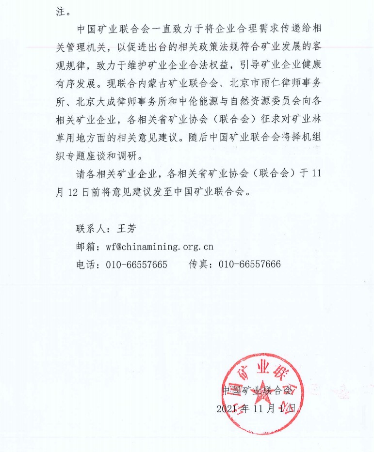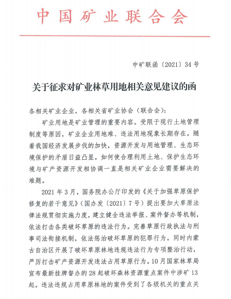 中國(guó)礦業(yè)聯(lián)合會(huì):關(guān)于征求對(duì)礦業(yè)林草用地相關(guān)意見建議的函