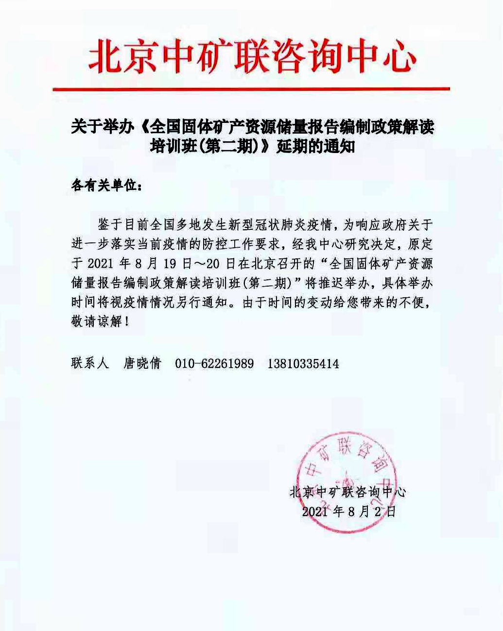 關(guān)于延期《全國(guó)固體礦產(chǎn)資源儲(chǔ)量報(bào)告編制政策解讀培訓(xùn)班(第二期)》的通知