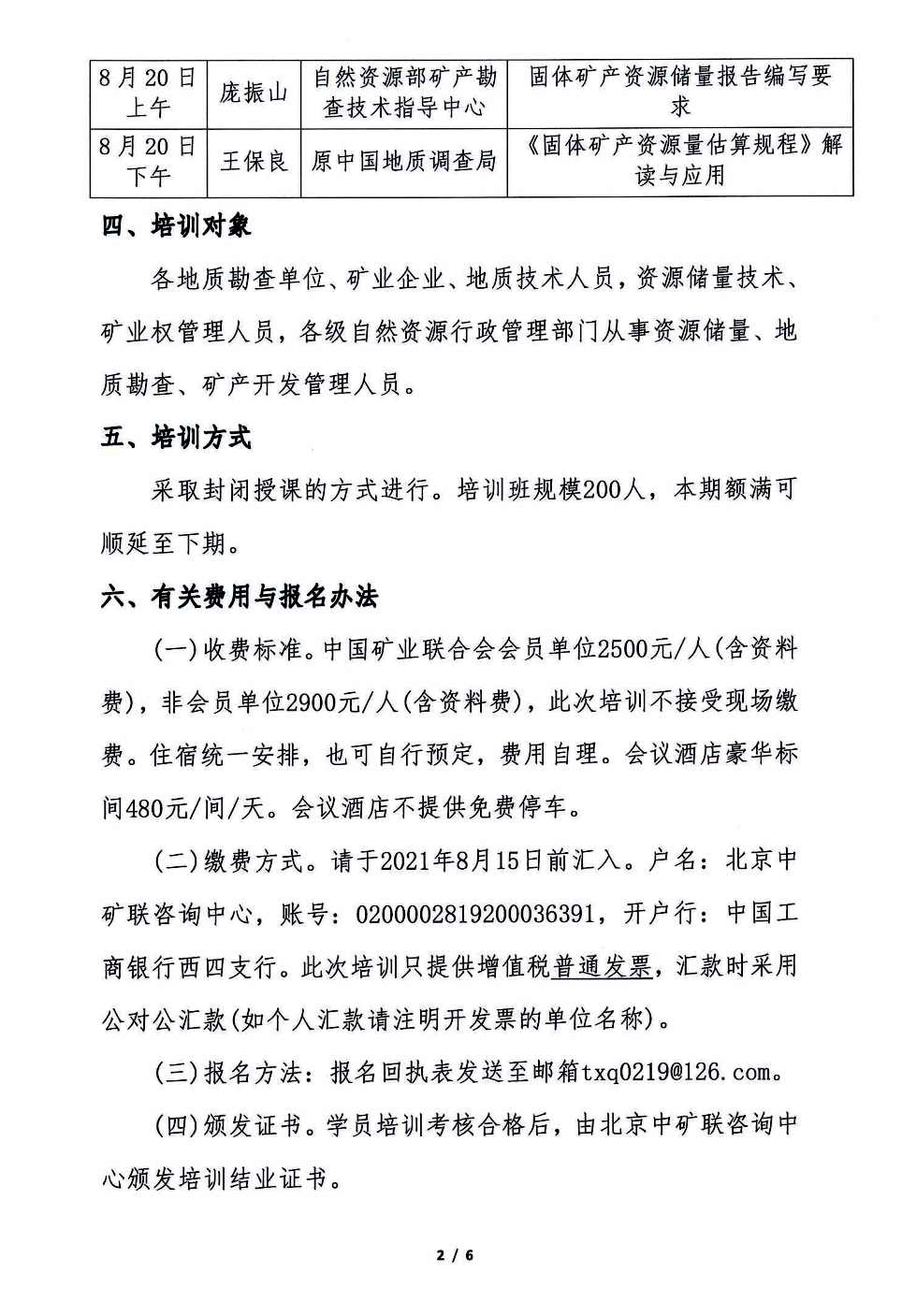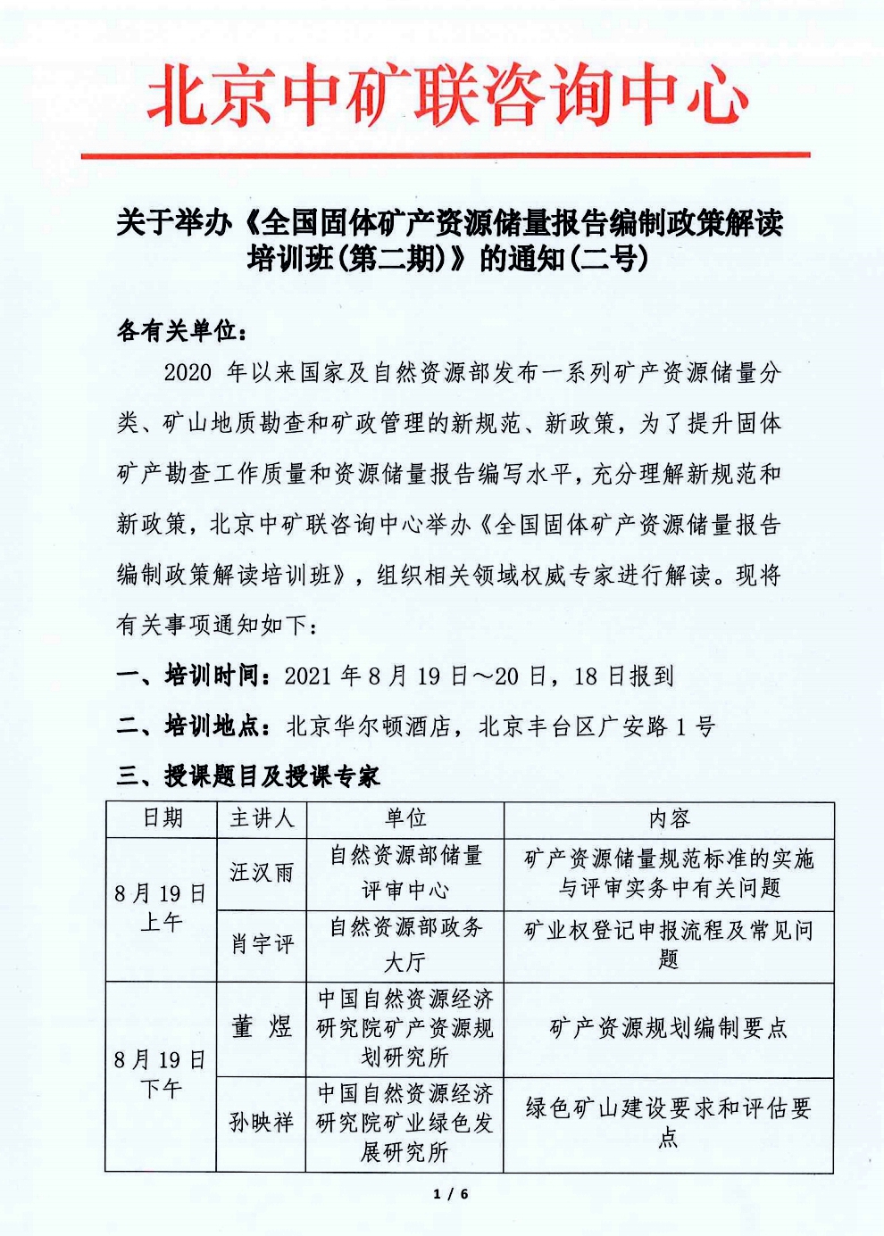 2020年以來國家及自然資源部發(fā)布一系列礦產(chǎn)資源儲(chǔ)量分類、礦山地質(zhì)勘查和礦政管理的新規(guī)范、新政策,為了提升固體礦產(chǎn)勘查工作質(zhì)量和資源儲(chǔ)量報(bào)告編寫水平,充分理解新規(guī)范和新政策,北京中礦聯(lián)咨詢中心舉辦《全國固體礦產(chǎn)資源儲(chǔ)量報(bào)告編制政策解讀培訓(xùn)班》,組織相關(guān)領(lǐng)域權(quán)威專家進(jìn)行解讀?,F(xiàn)將有關(guān)事項(xiàng)通知如下: