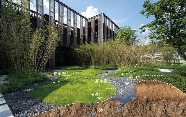 場(chǎng)地設(shè)計(jì)利用綠化緩坡收集凈化雨水,建立植被緩沖帶減少污染,采用鄉(xiāng)土植物降低水的消耗。