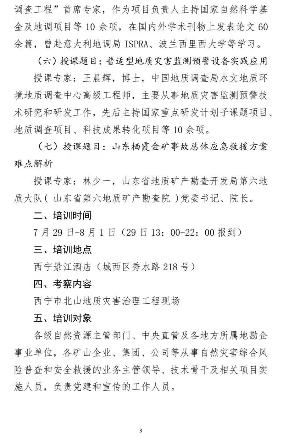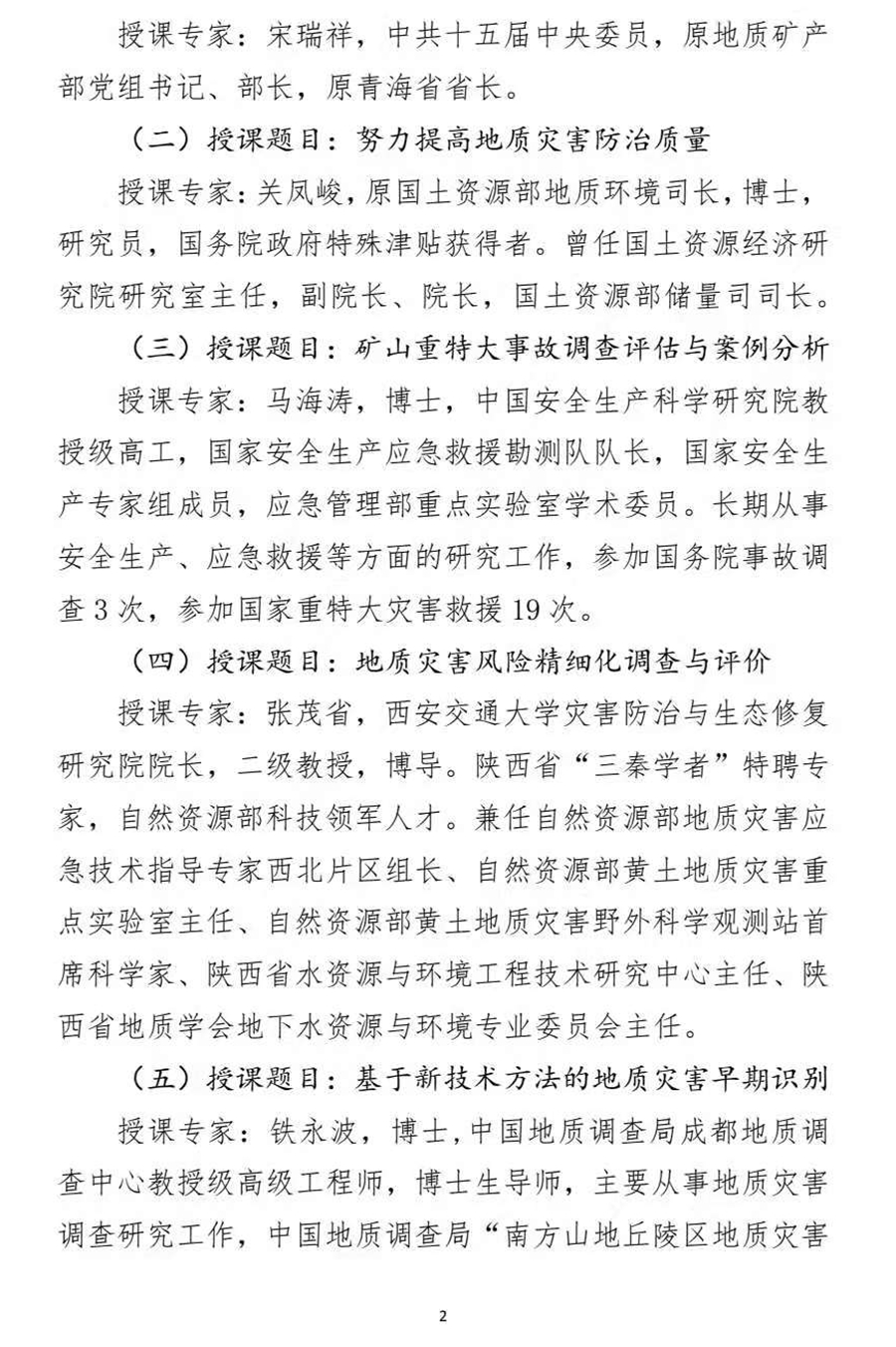 授課題目包括:從百年黨史中吸取地質轉型發(fā)展的智慧和力量,努力提高地質災害防治質量,礦山重特大事故調查評估與案例分析,地質災害風險精細化調查與評價,基于新技術方法的地質災害早期識別,普適型地質災害監(jiān)測預警設備實踐應用,山東棲霞金礦事故總體應急救援方案難點解析等七大課目。