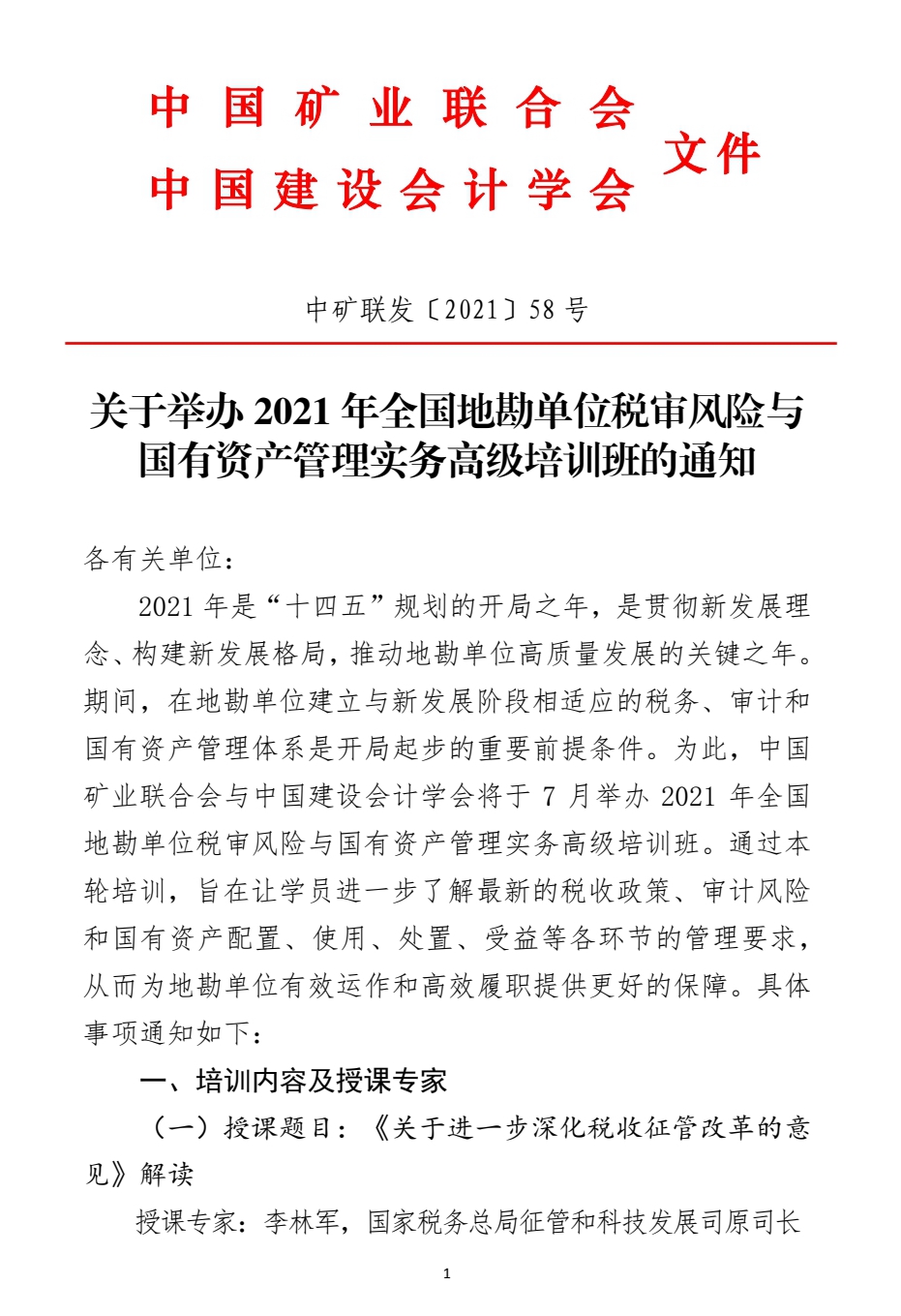 關(guān)于舉辦2021年全國(guó)地勘單位稅審風(fēng)險(xiǎn)與國(guó)有資產(chǎn)管理實(shí)務(wù)高級(jí)培訓(xùn)班的通知