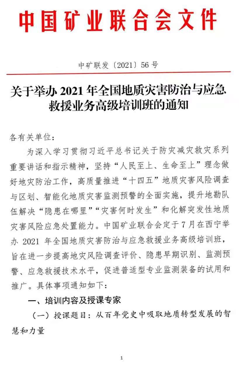 中國(guó)礦業(yè)聯(lián)合會(huì)定于 7 月在西寧舉辦 2021 年全國(guó)地質(zhì)災(zāi)害防治與應(yīng)急救援業(yè)務(wù)高級(jí)培訓(xùn)班,旨在進(jìn)一步提高地災(zāi)風(fēng)險(xiǎn)調(diào)查評(píng)價(jià)、隱患早期識(shí)別、監(jiān)測(cè)預(yù)警、應(yīng)急救援技術(shù)水平,促進(jìn)普適型專業(yè)監(jiān)測(cè)裝備的試用和推廣。具體事項(xiàng)通知如下: