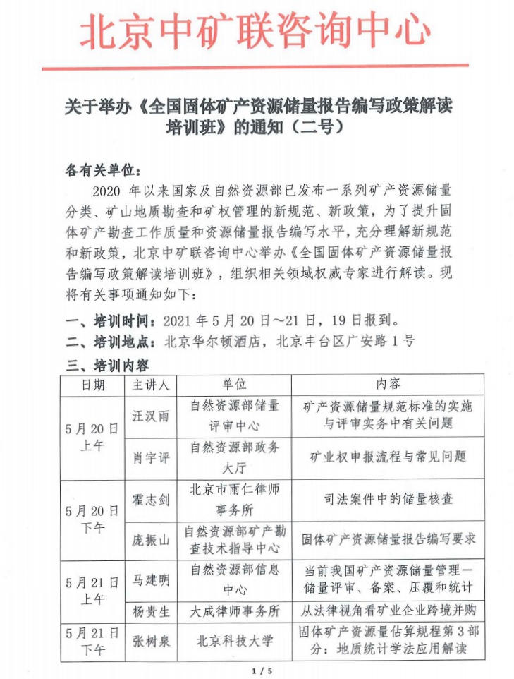 2020年以來國家及自然資源部已發(fā)布一系列礦產(chǎn)資源儲(chǔ)量分類、礦山地質(zhì)勘查和礦權(quán)管理的新規(guī)范、新政策,為了提升固體礦產(chǎn)勘查工作質(zhì)量和資源儲(chǔ)量報(bào)告編寫水平,充分理解新規(guī)范和新政策,北京中礦聯(lián)咨詢中心舉辦《全國固體礦產(chǎn)資源儲(chǔ)量報(bào)告編寫政策解讀培訓(xùn)班》,組織相關(guān)領(lǐng)域權(quán)威專家進(jìn)行解讀?,F(xiàn)將有關(guān)事項(xiàng)通知如下: