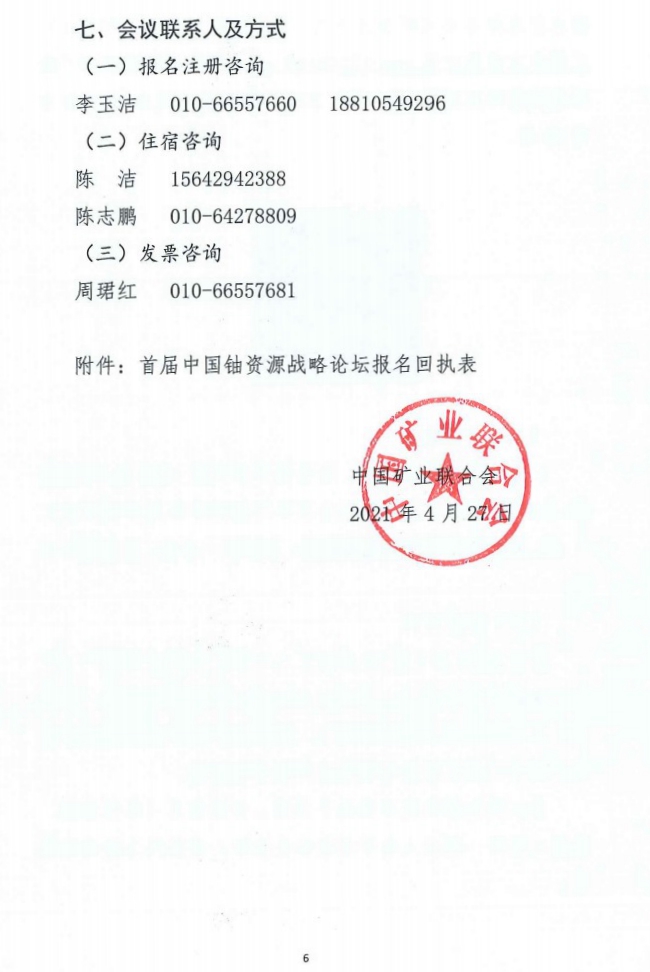 在以國內(nèi)大循環(huán)為主體,國內(nèi)國際雙循環(huán)相互促進(jìn)的新發(fā)展格局下,貫徹落實(shí)習(xí)近平總書記關(guān)于全面提升核工業(yè)核心競爭力的指示精神,對我國鈾資源領(lǐng)域取得的成果及進(jìn)展進(jìn)行回顧,共同探討新格局下我國鈾資源戰(zhàn)略發(fā)展的方向。由中國礦業(yè)聯(lián)合會(huì)主辦的首屆“中國鈾資源戰(zhàn)略論壇”將于2021年5月15日在京召開?,F(xiàn)將有關(guān)事項(xiàng)通知如下: