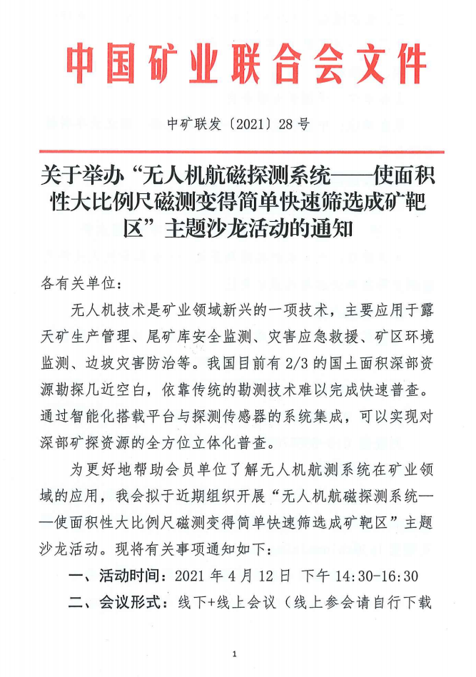 關(guān)于舉辦“無人機(jī)航磁探測系統(tǒng)——使面積性大比例尺磁測變得簡單快速篩選成礦靶區(qū)”主題沙龍活動(dòng)的通知