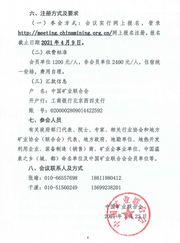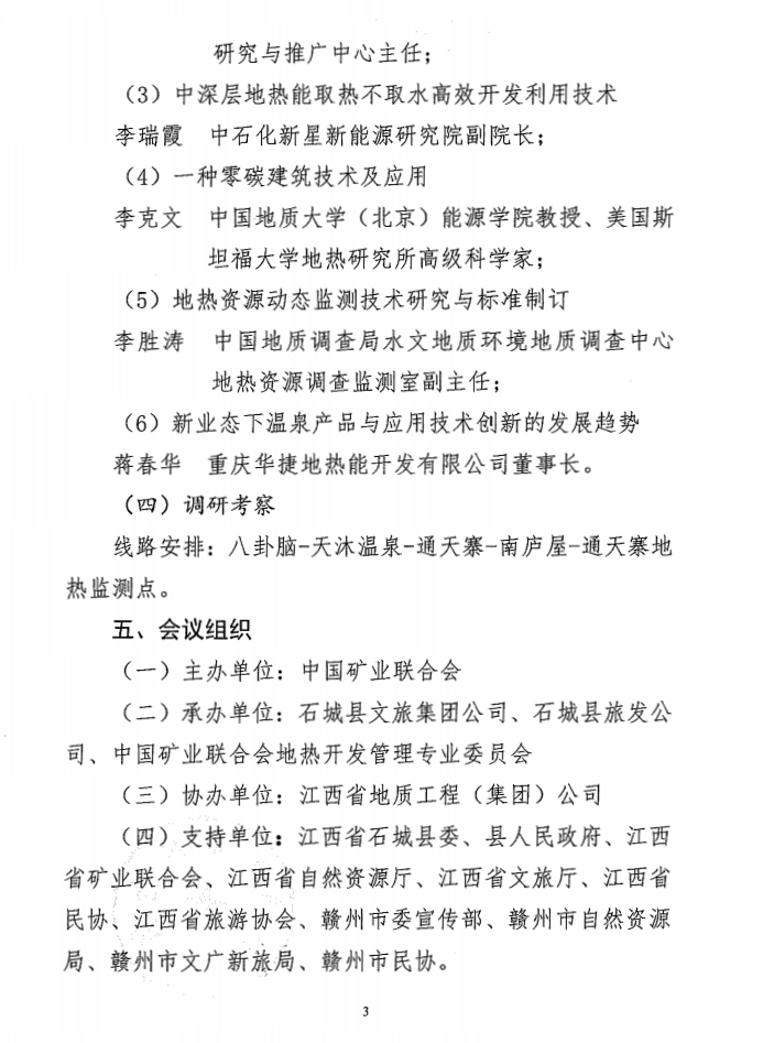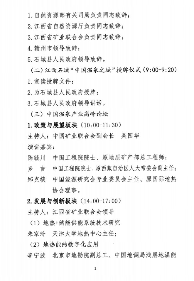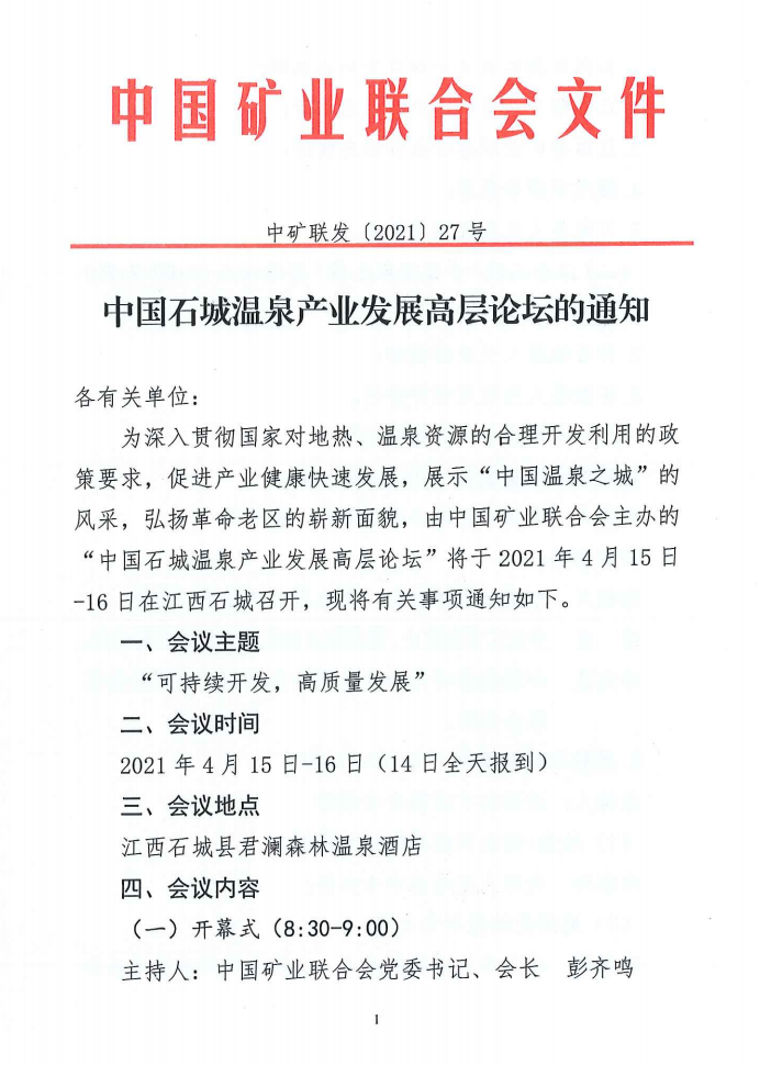 為深入貫徹國家對地熱、溫泉資源的合理開發(fā)利用的政策要求,促進產業(yè)健康快速發(fā)展,展示“中國溫泉之城”的風采,弘揚革命老區(qū)的嶄新面貌,由中國礦業(yè)聯合會主辦的“中國石城溫泉產業(yè)發(fā)展高層論壇”將于2021年4月15日—16日在江西石城召開,現將有關事項通知如下。