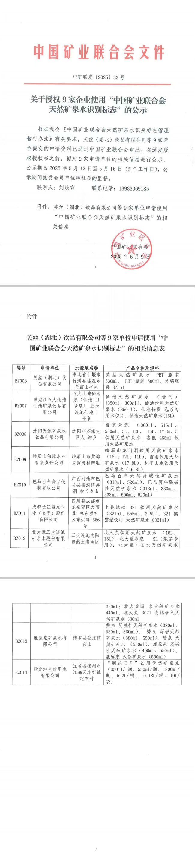 根據(jù)我會《中國礦業(yè)聯(lián)合會天然礦泉水識別標志管理暫行辦法》有關要求,芙絲(湖北)飲品有限公司等9家單位提交的申請資料已通過中國礦業(yè)聯(lián)合會審批。在頒發(fā)版權授權書之前,擬對9家申請單位的相關信息進行公示,公示期為2025年 5 月12日至5月16日(5個工作日),公示期間接受會員單位和社會的監(jiān)督。