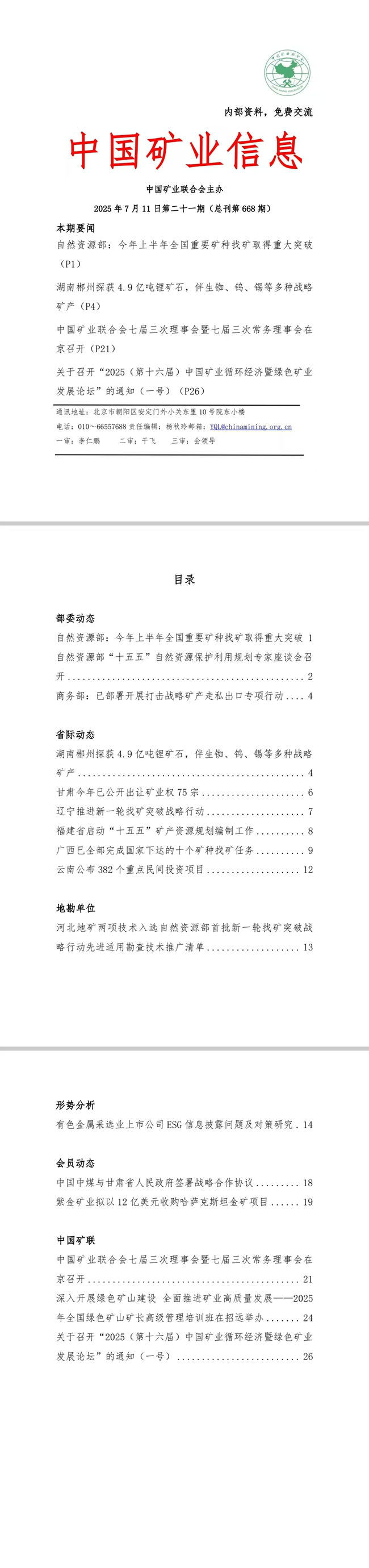 2025年7月7日—7月11日《中國(guó)礦業(yè)信息》第二十一期(總刊第668期)
