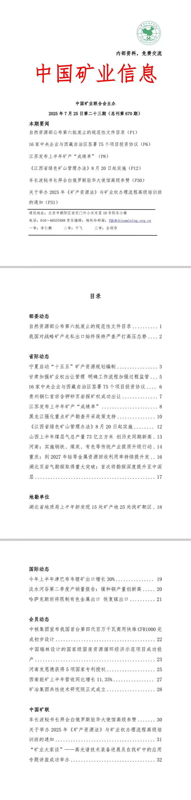 2025年7月21日—7月25日《中國(guó)礦業(yè)信息》第二十三期(總刊第670期)