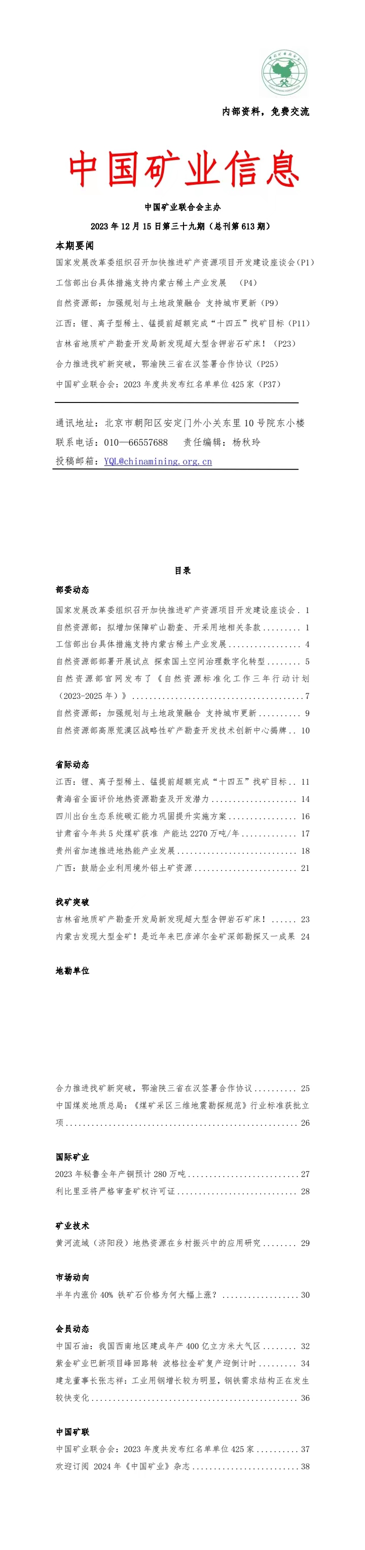 中國礦業(yè)網(wǎng):2023年12月11日—12月15日《中國礦業(yè)信息》第三十九期