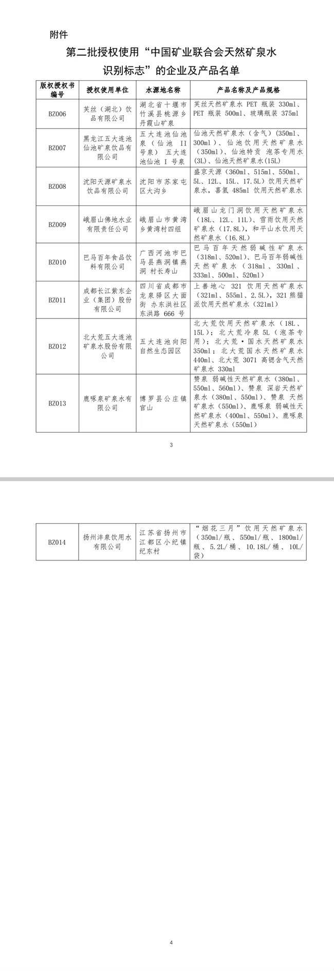 附件:第二批授權(quán)使用“中國礦業(yè)聯(lián)合會天然礦泉水識別標(biāo)志”的企業(yè)及產(chǎn)品名單