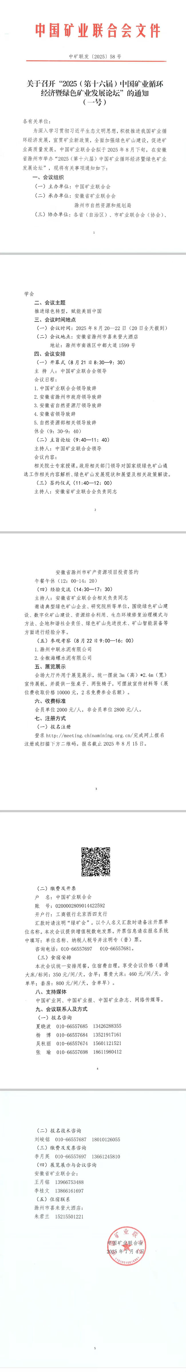 為深入學(xué)習(xí)貫徹習(xí)近平生態(tài)文明思想,積極推進(jìn)我國(guó)礦業(yè)循環(huán)經(jīng)濟(jì)發(fā)展,宣貫礦業(yè)新政策,全面加強(qiáng)綠色礦山建設(shè),促進(jìn)礦業(yè)高質(zhì)量發(fā)展。中國(guó)礦業(yè)聯(lián)合會(huì)擬于2025年8月下旬,在安徽省滁州市舉辦“2025(第十六屆)中國(guó)礦業(yè)循環(huán)經(jīng)濟(jì)暨綠色礦業(yè)發(fā)展論壇”,現(xiàn)將有關(guān)事項(xiàng)通知如下: