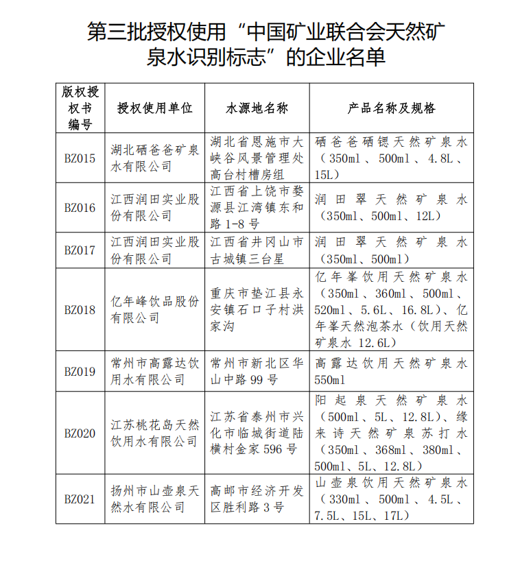 第三批授權(quán)使用“中國礦業(yè)聯(lián)合會(huì)天然礦泉水識(shí)別標(biāo)志”的企業(yè)名單公告