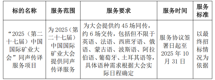 一、項目名稱:“2025(第二十七屆)中國國際礦業(yè)大會”同聲傳譯服務(wù)項目