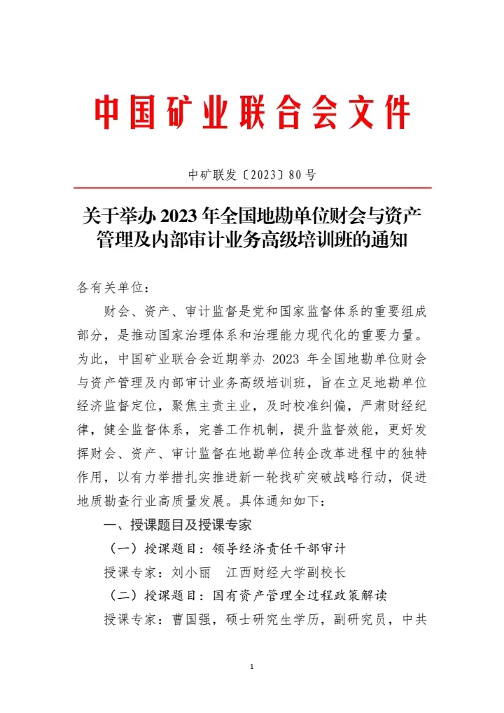 關(guān)于舉辦2023年全國(guó)地勘單位財(cái)會(huì)與資產(chǎn)管理及內(nèi)部審計(jì)業(yè)務(wù)高級(jí)培訓(xùn)班的通知