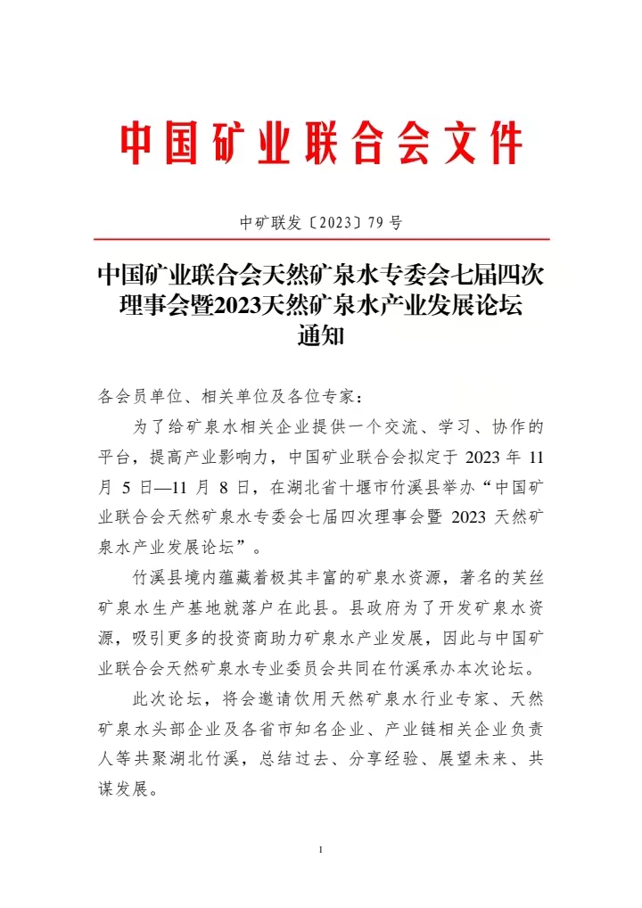 中國礦業(yè)聯(lián)合會(huì)天然礦泉水專委會(huì)七屆四次理事會(huì)暨2023天然礦泉水產(chǎn)業(yè)發(fā)展論壇通知