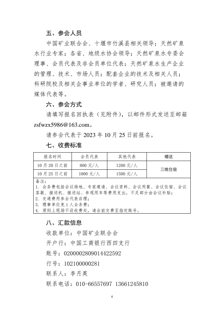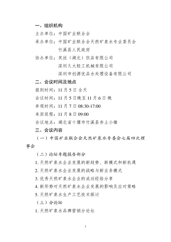 為了給礦泉水相關(guān)企業(yè)提供一個(gè)交流、學(xué)習(xí)、協(xié)作的平臺(tái),提高產(chǎn)業(yè)影響力,中國礦業(yè)聯(lián)合會(huì)擬定于 2023 年 11月 5 日-11 月 8 日,在湖北省十堰市竹溪縣舉辦“中國礦業(yè)聯(lián)合會(huì)天然礦泉水專委會(huì)七屆四次理事會(huì)暨 2023 天然礦泉水產(chǎn)業(yè)發(fā)展論壇”。
