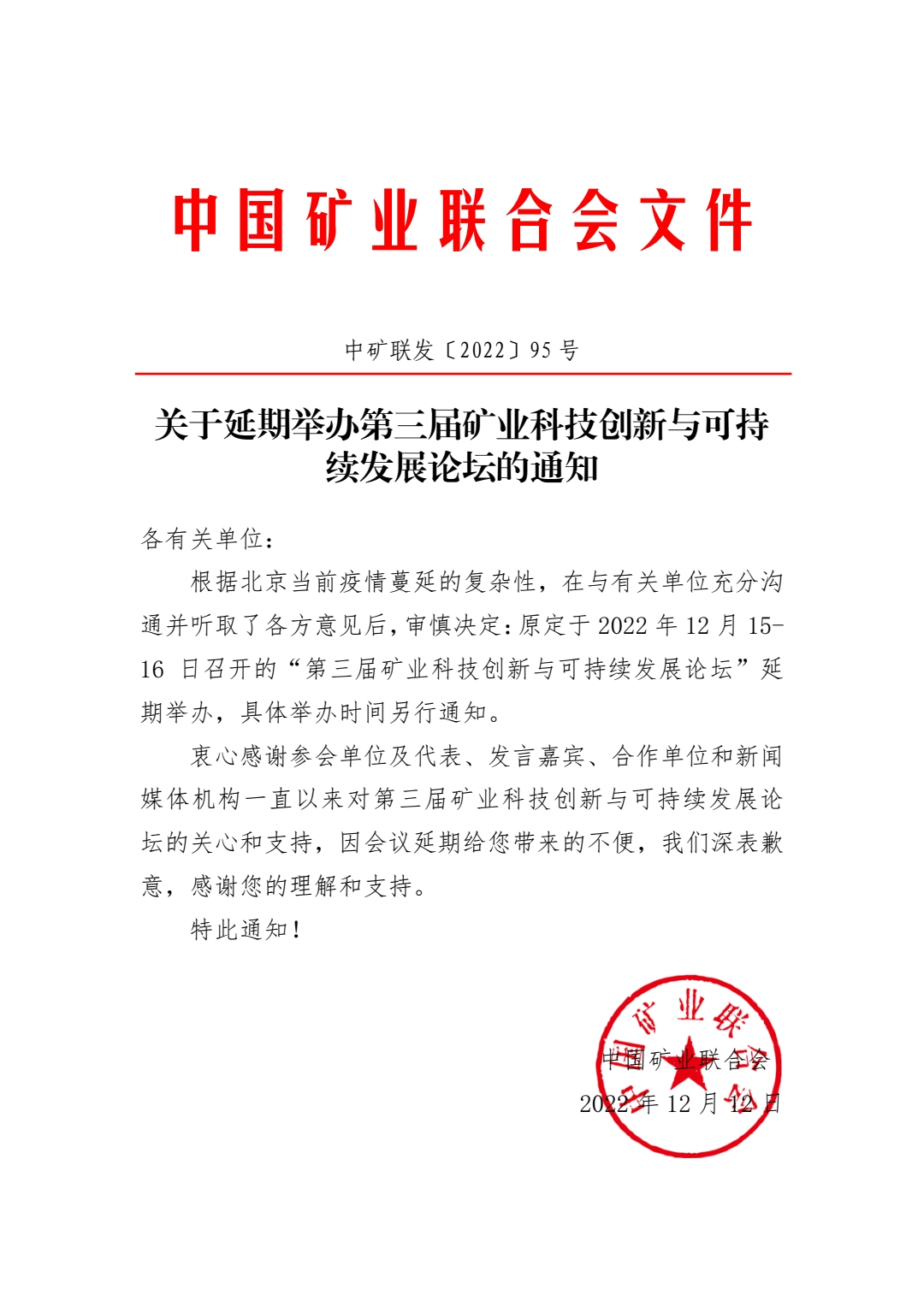 關(guān)于延期舉辦第三屆礦業(yè)科技創(chuàng)新與可持續(xù)發(fā)展論壇的通知