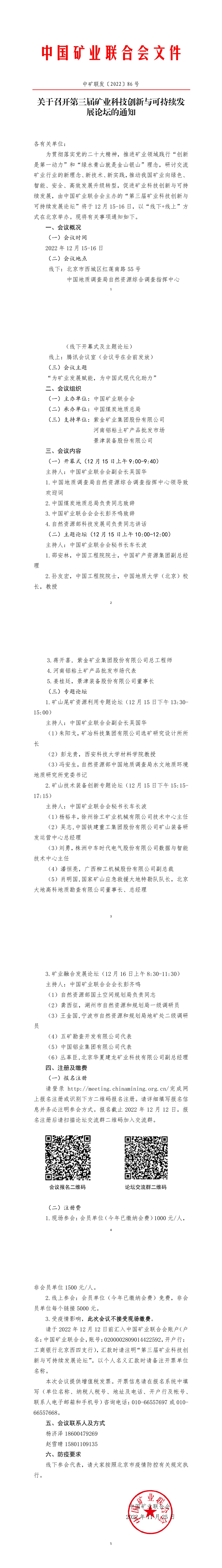 為貫徹落實(shí)黨的二十大精神,推進(jìn)礦業(yè)領(lǐng)域踐行“創(chuàng)新是第一動(dòng)力”和“綠水青山就是金山銀山”理念,研討交流礦業(yè)行業(yè)的新理念、新技術(shù)、新實(shí)踐,推動(dòng)我國礦業(yè)向綠色、智能、安全、高效發(fā)展升級(jí)轉(zhuǎn)型,促進(jìn)礦業(yè)科技創(chuàng)新與可持續(xù)發(fā)展,由中國礦業(yè)聯(lián)合會(huì)主辦的“第三屆礦業(yè)科技創(chuàng)新與可持續(xù)發(fā)展論壇”將于12月15-16日,以“線下+線上”方式在北京舉辦。