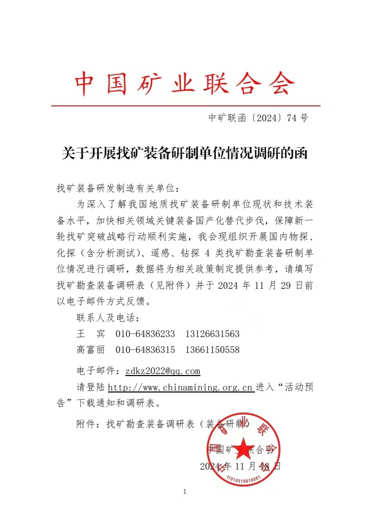中國礦業(yè)聯(lián)合會:關(guān)于開展找礦裝備研制單位情況調(diào)研的函