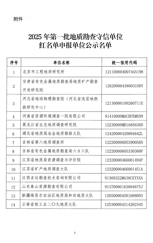 關(guān)于對2025年第一批地質(zhì)勘查守信單位紅名單申報單位進(jìn)行公示的通知