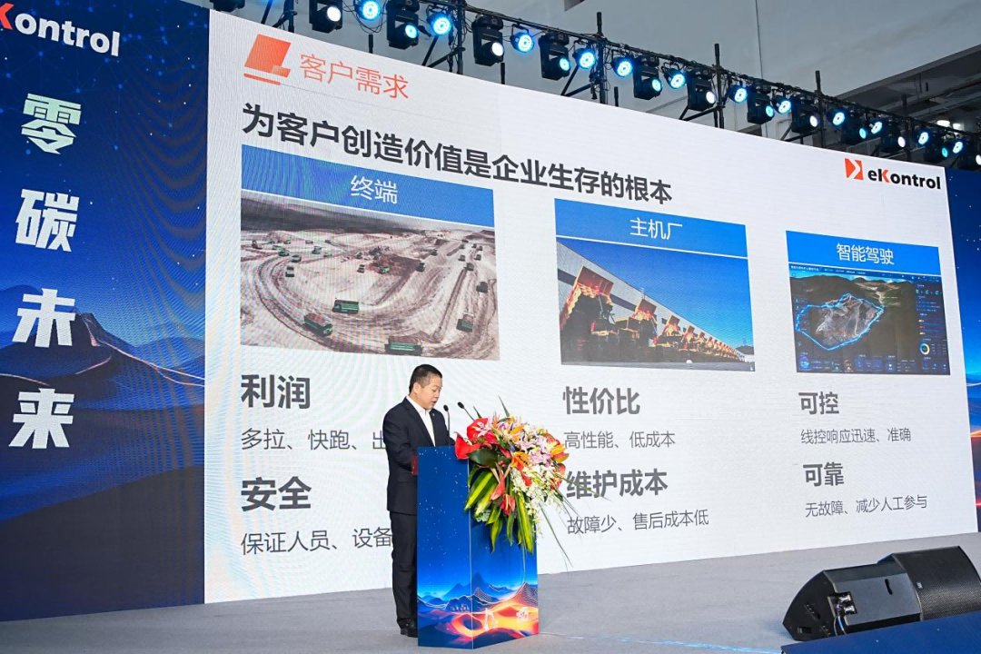 同力重工總經(jīng)理許亞楠、終端用戶華威礦業(yè)董事長(zhǎng)趙龍相繼發(fā)表致辭,對(duì)凱博易控礦山設(shè)備技術(shù)發(fā)布表示祝賀,對(duì)凱博長(zhǎng)期以來(lái)的產(chǎn)品表現(xiàn)予以肯定。2023年,同力與凱博合作了行業(yè)首批甲醇混動(dòng)非公路寬體自卸車;2024年,雙方合作的國(guó)內(nèi)首款180噸級(jí)多軸驅(qū)動(dòng)混合動(dòng)力礦用車引起行業(yè)震撼。今年,雙方將在無(wú)人駕駛場(chǎng)景進(jìn)行120噸級(jí)純電礦卡的研發(fā)與推廣,為“零碳未來(lái)、智慧礦山”邁出關(guān)鍵的一步。許亞楠談到:“面對(duì)日益嚴(yán)格的環(huán)保政策和資源利用效率提升的迫切需求,礦山裝備的綠色化與智能化已從‘錦上添花’的選項(xiàng),轉(zhuǎn)變?yōu)闆Q定企業(yè)競(jìng)爭(zhēng)力的核心要素。在這場(chǎng)變革中,誰(shuí)能率先突破技術(shù)瓶頸、實(shí)現(xiàn)低碳轉(zhuǎn)型,誰(shuí)就能在未來(lái)的市場(chǎng)競(jìng)爭(zhēng)中占據(jù)先機(jī)?!?/p>