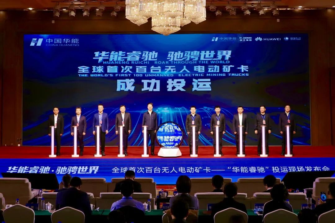 現(xiàn)場,楊東升與政府、協(xié)會(huì)、創(chuàng)新聯(lián)合體成員單位等十位領(lǐng)導(dǎo)嘉賓共同按下“啟動(dòng)鍵”——標(biāo)志著全球首次百臺(tái)無人電動(dòng)礦卡“華能睿馳”正式投運(yùn)。